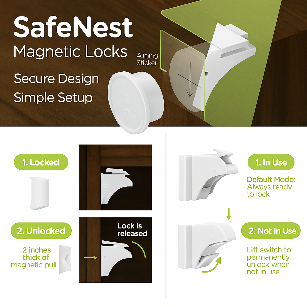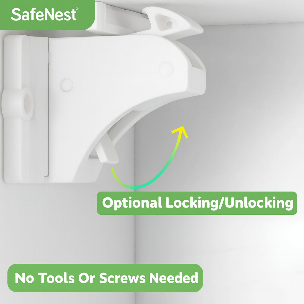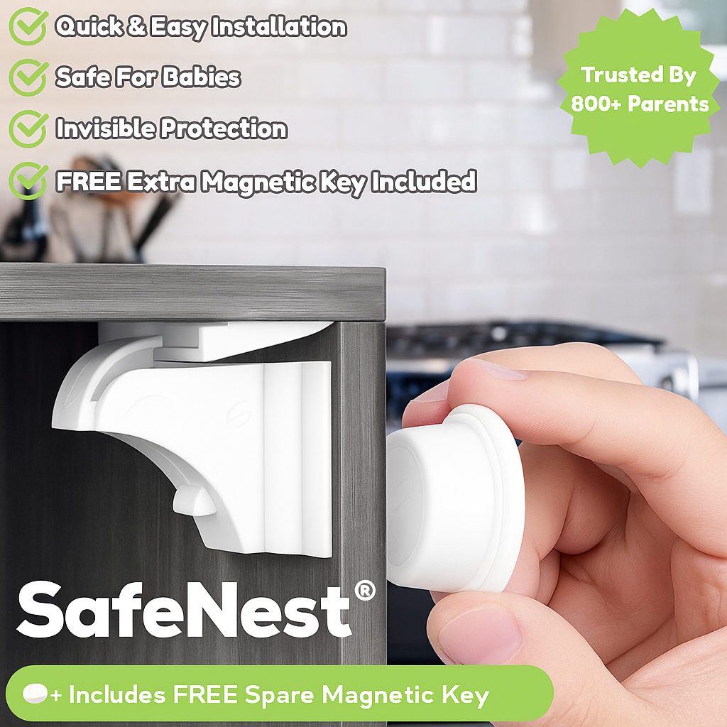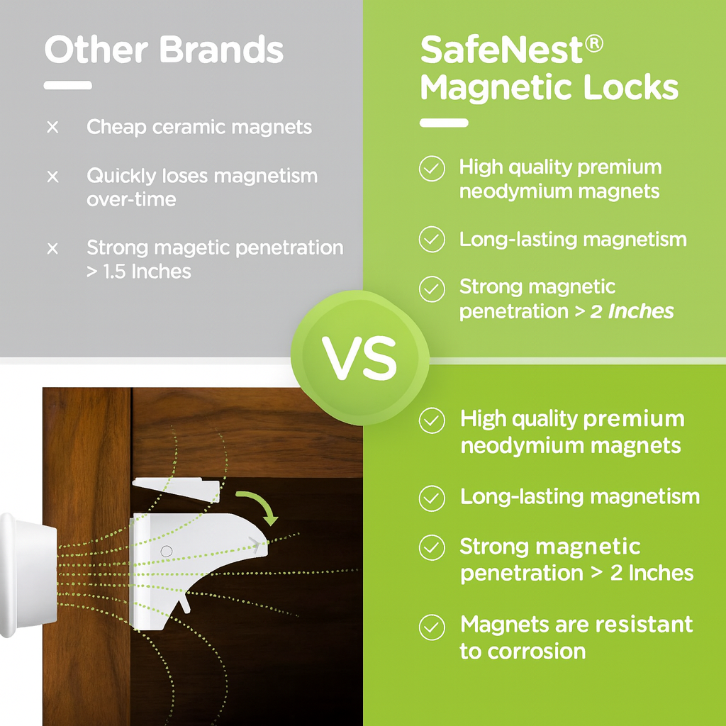 Curious kids can get into dangerous cabinets in seconds, but SafeNest® Magnetic Locks keep them safely out, giving you peace of mind.