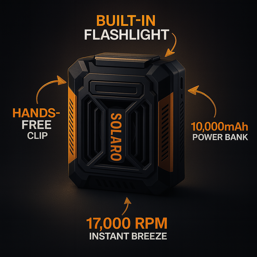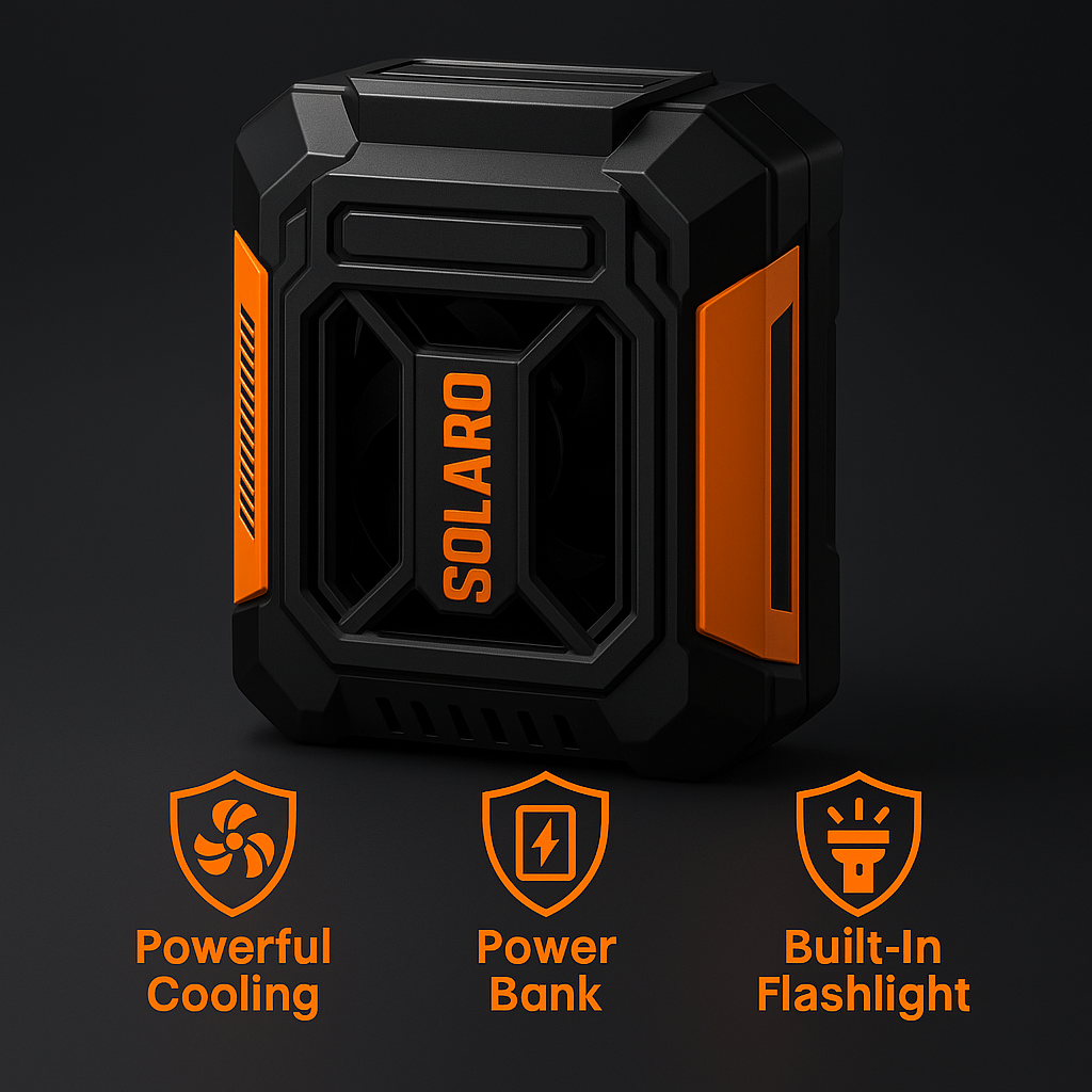 ✔ Solaro® Work Fan — Industrial-grade, dual-turbo cooling unit with integrated LED flashlight and power back.