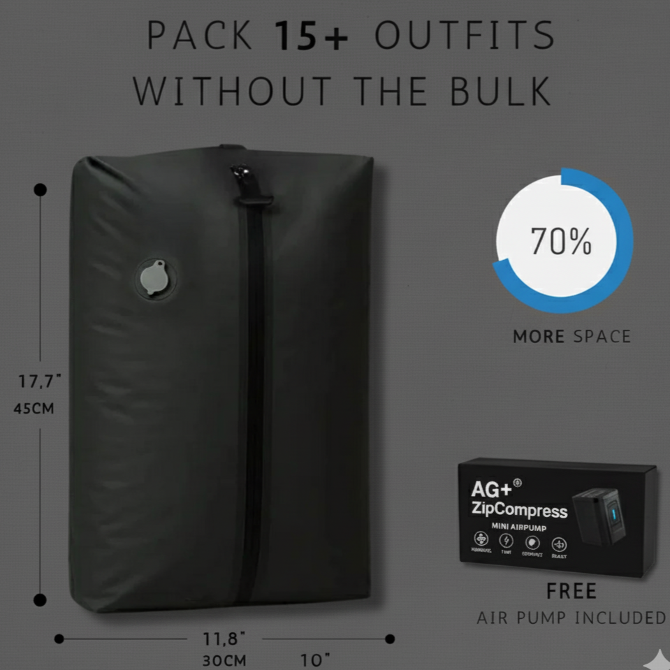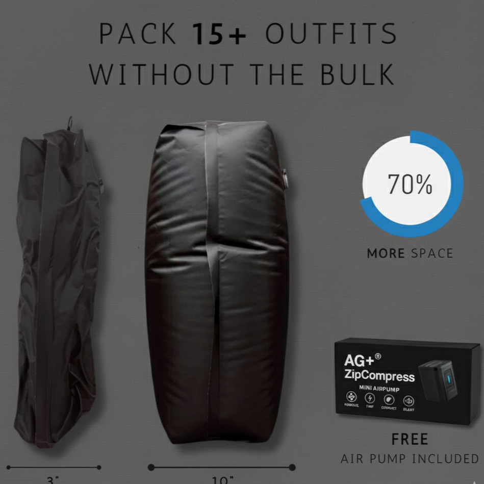 With AG+® ZipCompress, you’ll finally travel lighter, stay more organized, and carry everything you need without the bulk.